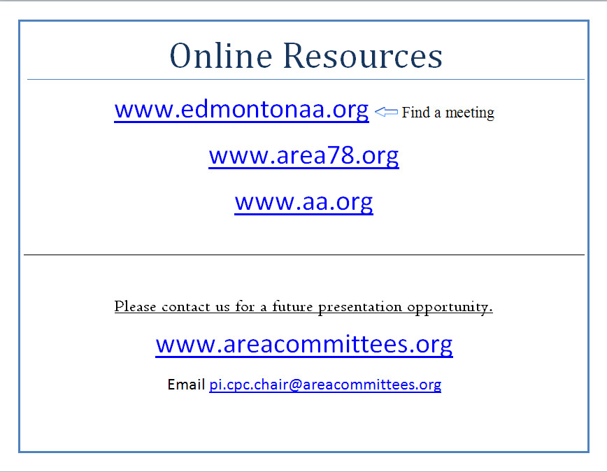 online_resourcesThe recommended literature for PI/CPC should be in the Committees’ supply cabinet at the back of the meeting room at Central Office.  If not, additional pamphlets are in the general literature racks at the Office.  Take only what you need, and ask the Central Office volunteer to charge the pamphlets to EGSC under PI/CPCs’ account, and return whatever is unused to the cabinet again for others to use.
